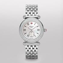 Product guide for Michele Woman's MWW16A000001 Caber Diamond Steel Bracelet Watch Secure push down fluted with Michele logo crown Deployment clasp Stainless steel case with a stainless steel bracelet Mineral crystal Case